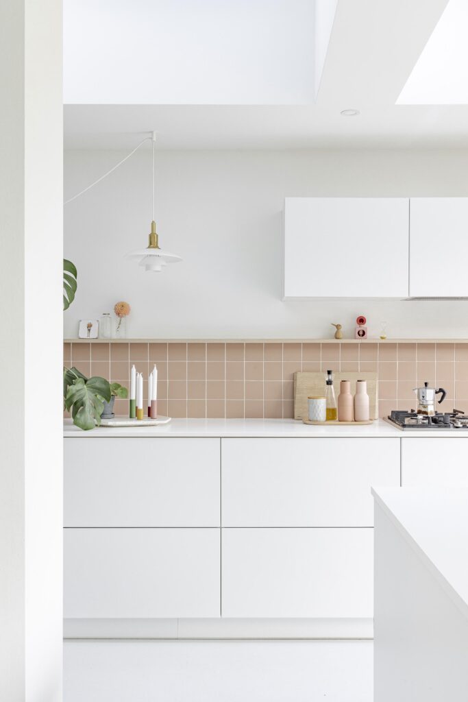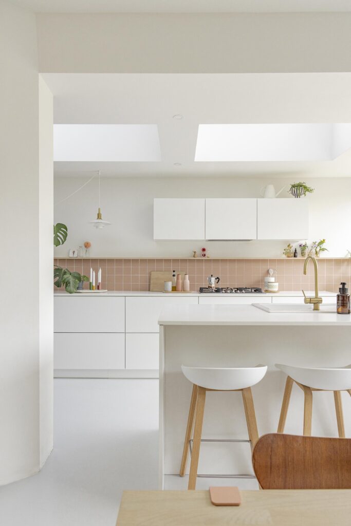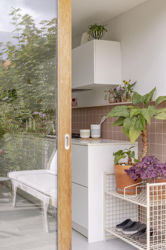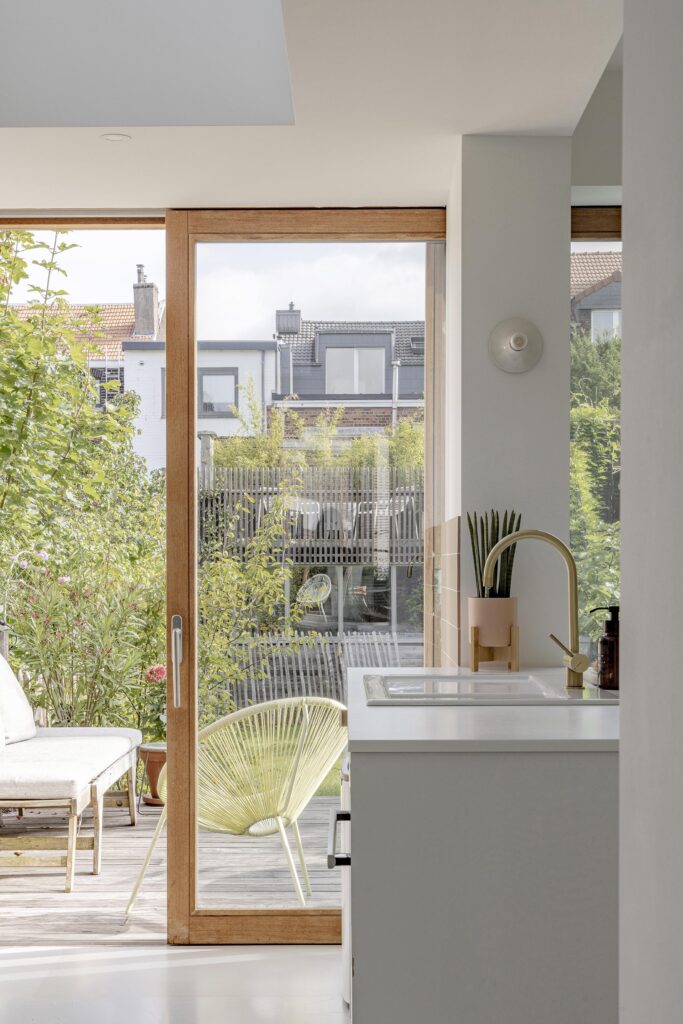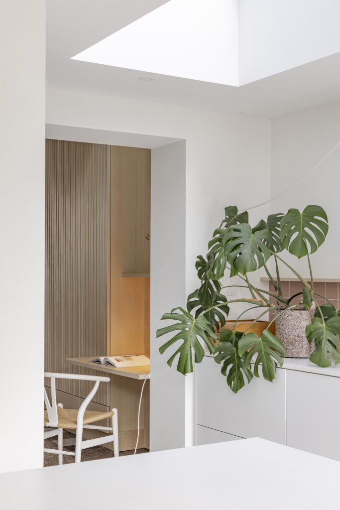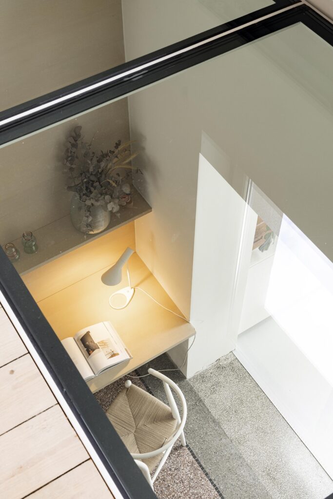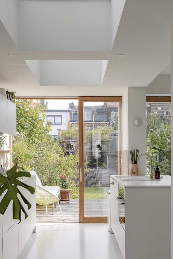 La lumière naturelle et les relations avec l’extérieur sont renforcées par l’intégration d’un grand châssis coulissant, de fenêtres de toit et d’une verrière, transformant un rez-de-chaussée profond en un espace largement ouvert et lumineux.