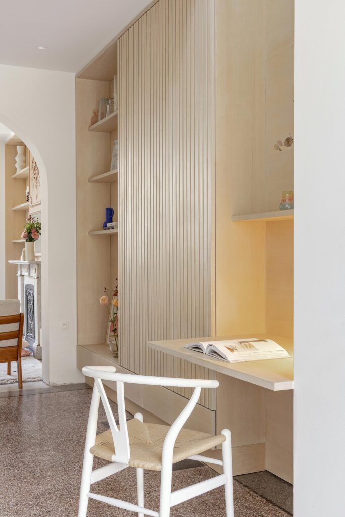 Un mobilier sur mesure en frêne clair est conçu pour intégrer bureau, cheminée, télévision et rangements discrets, assurant fluidité, cohérence et modularité des usages.