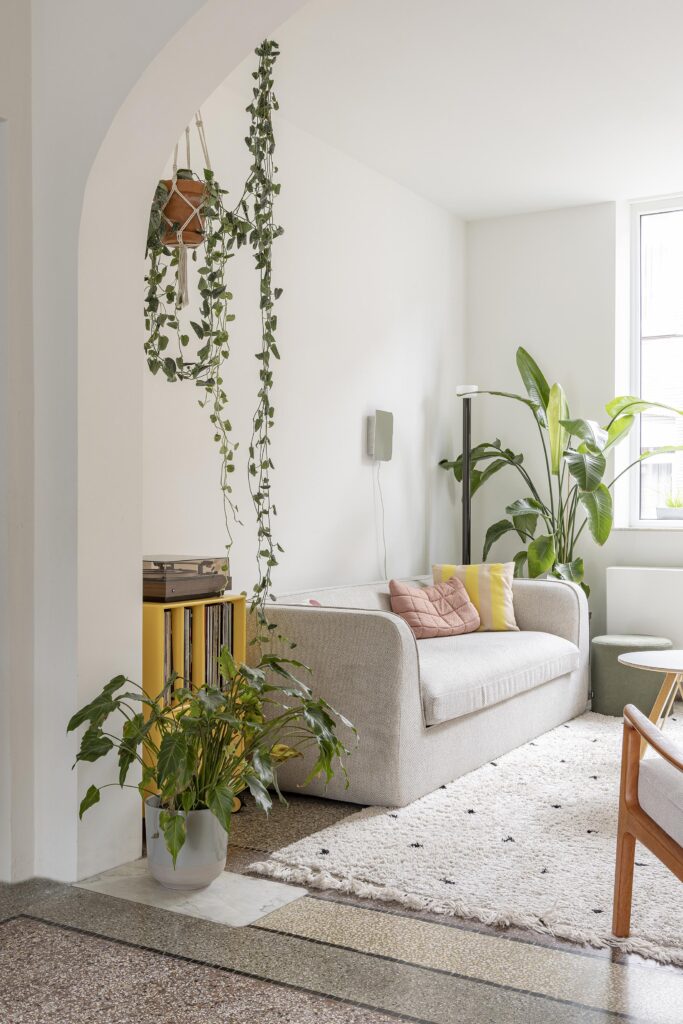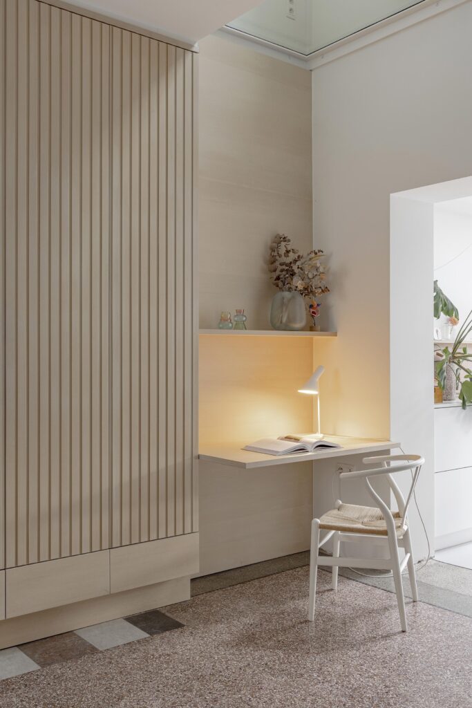 L’ensemble est complété par un choix attentif de matériaux, de couleurs et de pièces iconiques, neuves ou issues de la seconde main, afin de créer un intérieur harmonieux, chaleureux et parfaitement adapté à un contexte de vie personnel exigeant.