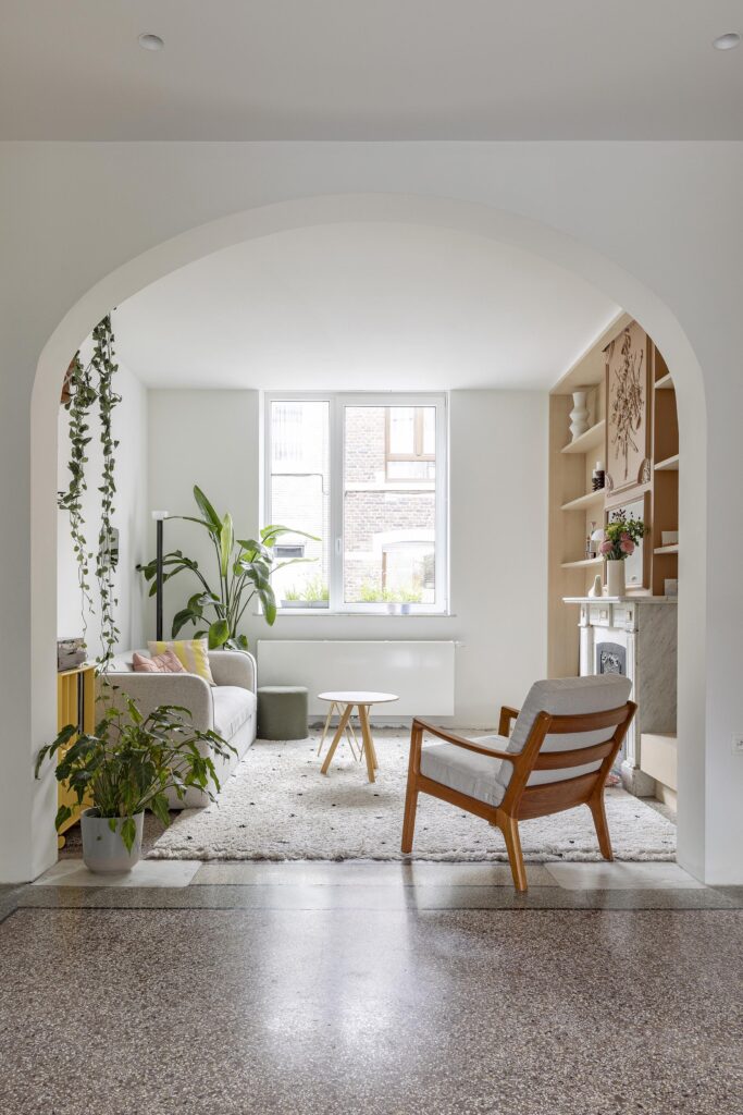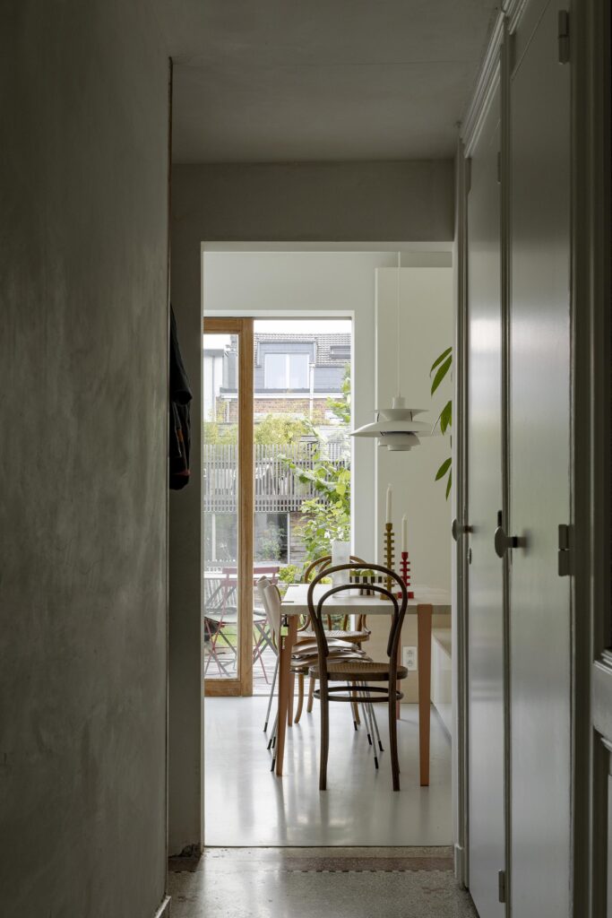 À la suite d’une séparation, Laurie entreprend la rénovation, en urgence et avec un budget contraint, d’une maison typiquement liégeoise. Le projet vise à préserver le caractère existant du bâtiment tout en améliorant significativement ses performances énergétiques. Les matériaux d’origine — granito, planchers en sapin et escalier en hêtre — sont conservés, restaurés et mis en valeur.