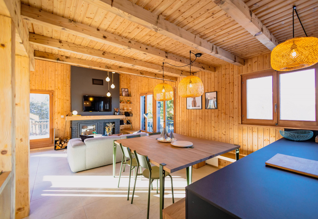 Les finitions, l’éclairage et le mobilier sont choisis pour créer un ensemble harmonieux, valorisant les espaces ouverts, les panoramas et la convivialité du chalet. Les salles de bains, conservées pour cette phase, seront rénovées ultérieurement dans la continuité de la transformation.